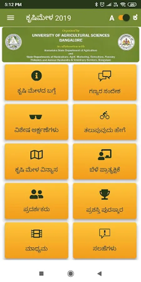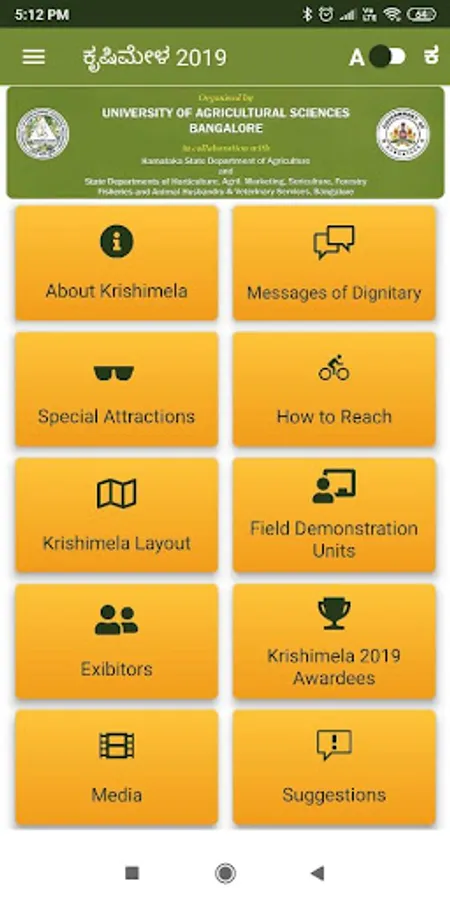 This App is built specifically for 2019 edition of Krishimela. It provides information about the event, special attractions, message from Vice Chancellor, Minister and Director of Education, Venue details and route map to reach, a form to submit suggestions, list of awardees and exhibitors.