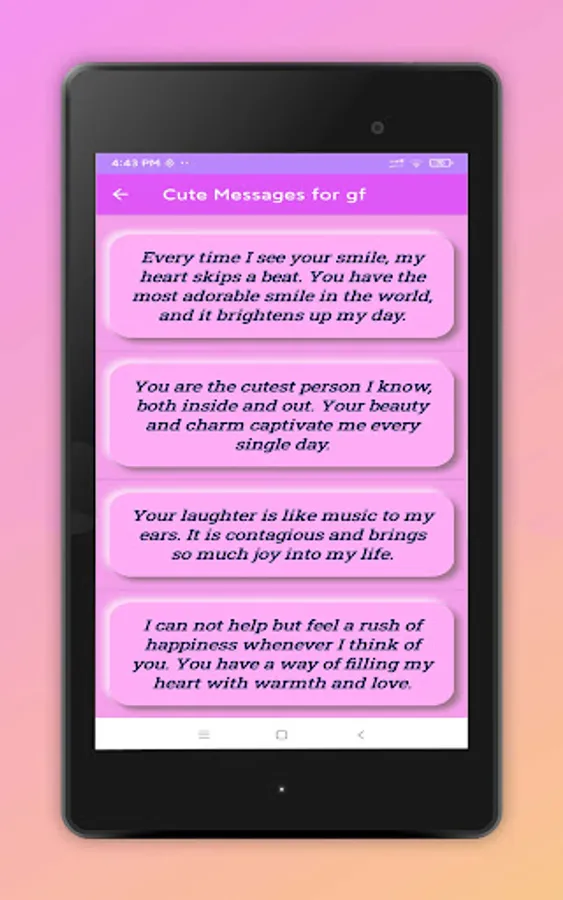 8. Share and Spread Love: Express your affection effortlessly by sharing the messages directly from the app via various communication channels, including SMS, social media platforms, messaging apps, and email. Spread love and make your girlfriend's day brighter by sending heartfelt messages with just a few taps.