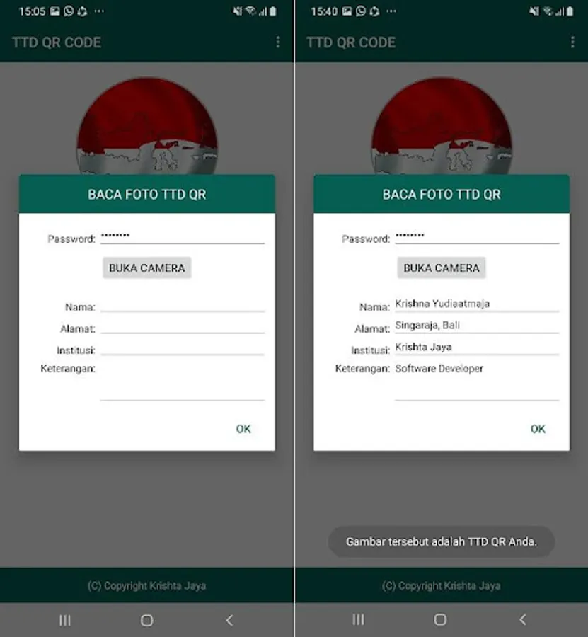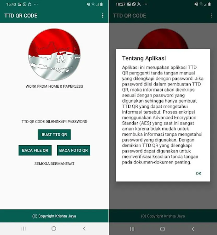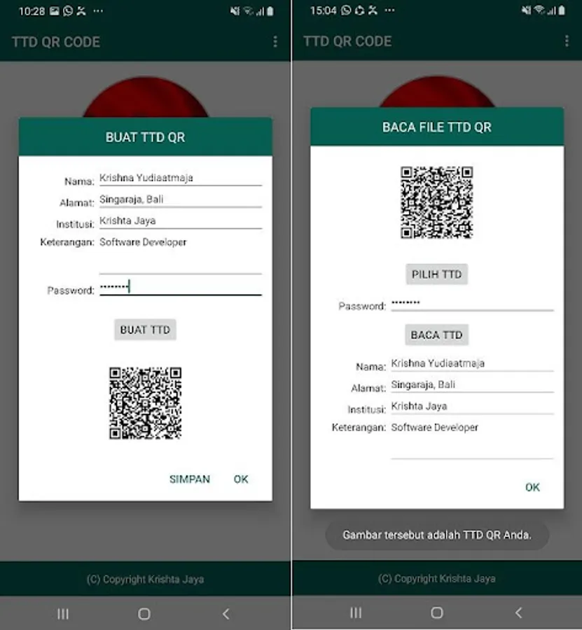 This application is a digital signature application that replaces a manual signature with a personal password. Digital signatures can also use passwords that are managed collectively through institutions but are more vulnerable to abuse. If in this application, the password is filled in making a digital signature (TTD QR), then the information is encrypted according to the password used so that only the TTD QR maker can find out the information. The encryption process uses Advanced Encryption Standard which is currently very safe because it is not easy to open information without knowing the password used. However, the encryption process becomes ineffective if the password used is easy to guess. Therefore, make sure the password used has an adequate number of characters and a combination of numbers, letters and / or symbols. Thus a TTD QR with a password can be used to verify the authenticity of signatures on important documents.