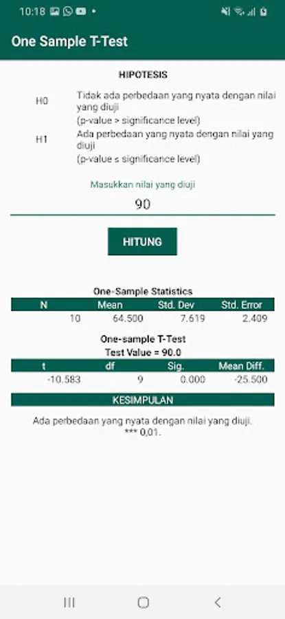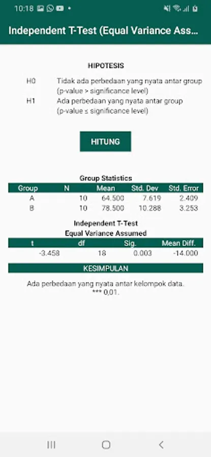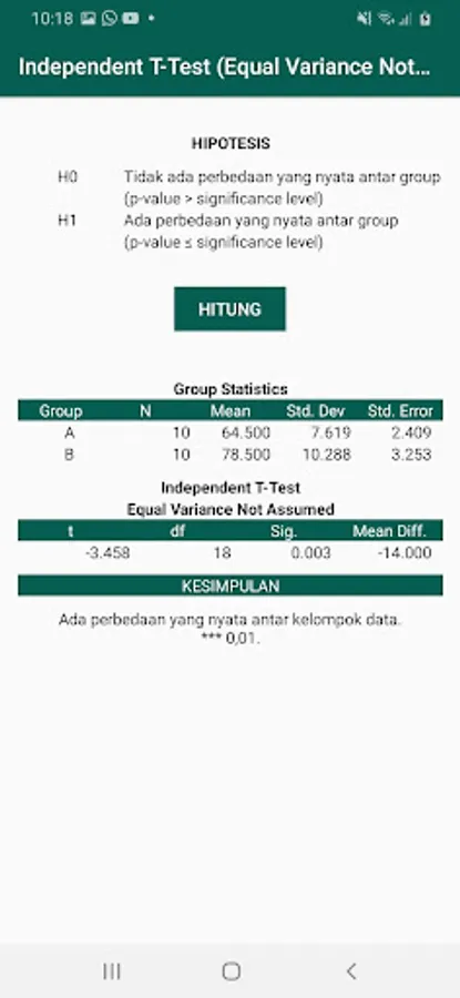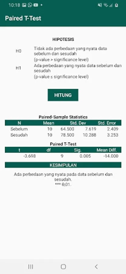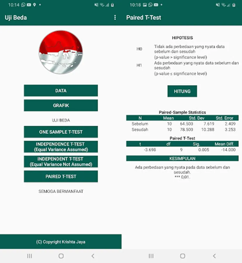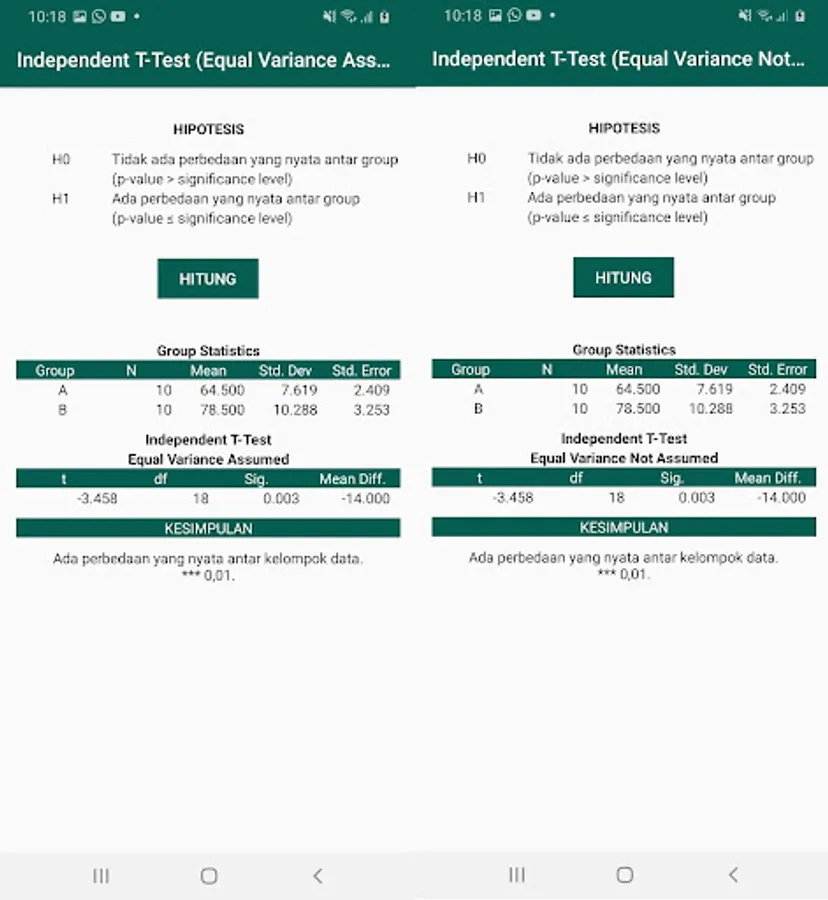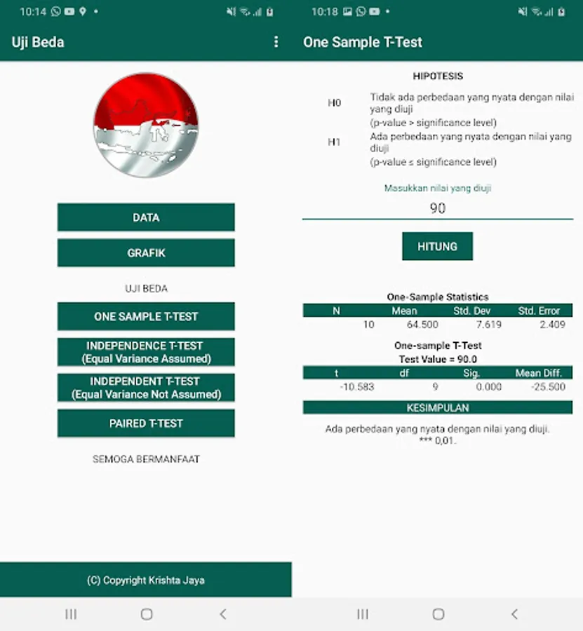 This application is used to perform a different test (mean difference). Different test analysis techniques consist of three, namely One Sample T-Test, Independent T-Test (equal variance assumed and equal variance not assumed) and Paired T-Test.