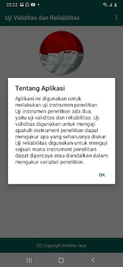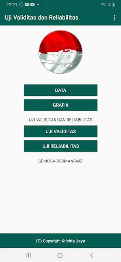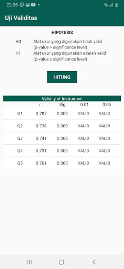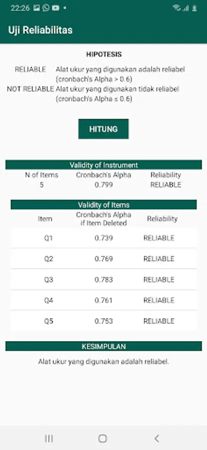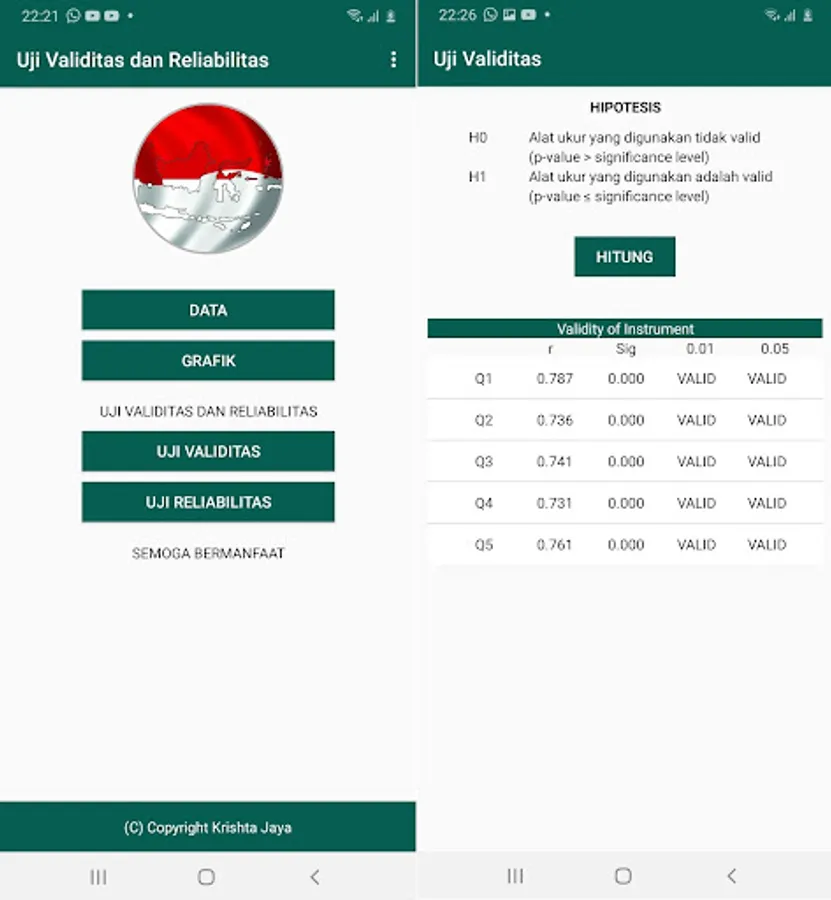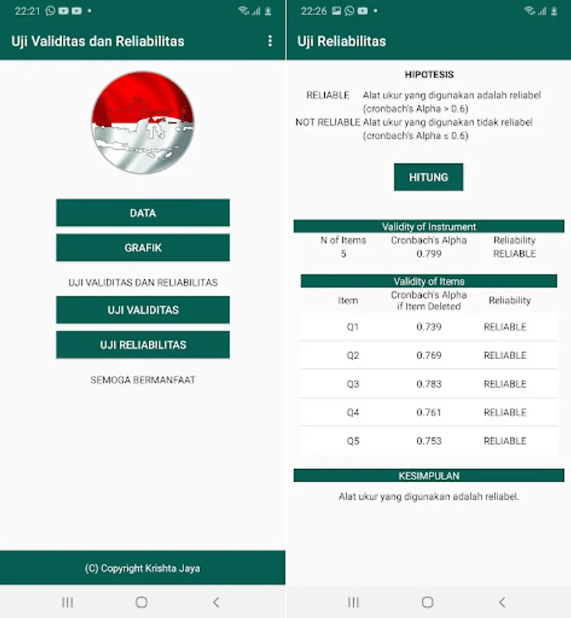 This application is used to test research instruments. There are two research instrument tests, namely validity and reliability tests. Validity test is used to test whether the research instrument can measure what it should measure. Reliability test is used to test the extent to which the research instrument can be trusted or relied upon in measuring research variables.