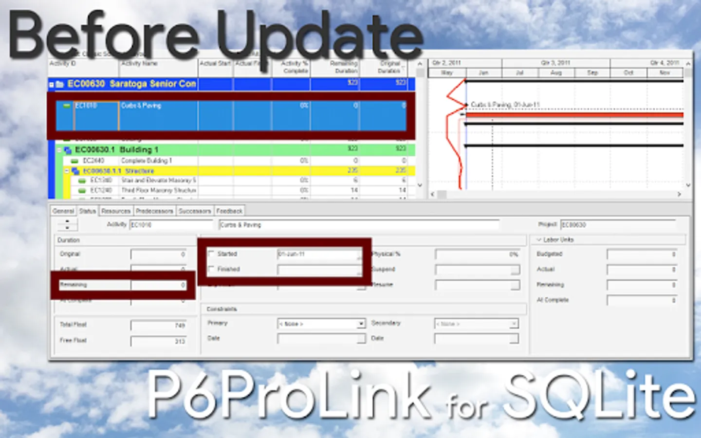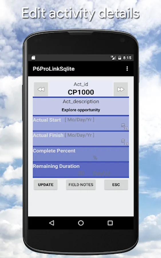 This Android P6Pro sqlite application enables Primavera P6 Professional stand-alone users using default P6 sqlite database to remotely update the P6Pro database whether from construction site or from other remote areas than where the P6Pro software is located. The raw construction progress data collected have to be verified/confirmed by P6Pro user before scheduling in P6Pro software. When the activities’ progress data have been confirmed, the user only has to press F9 or use schedule option in the P6Pro program. This application eliminates the double data input by P6Pro user when updating a project schedule file from construction site and at the office.