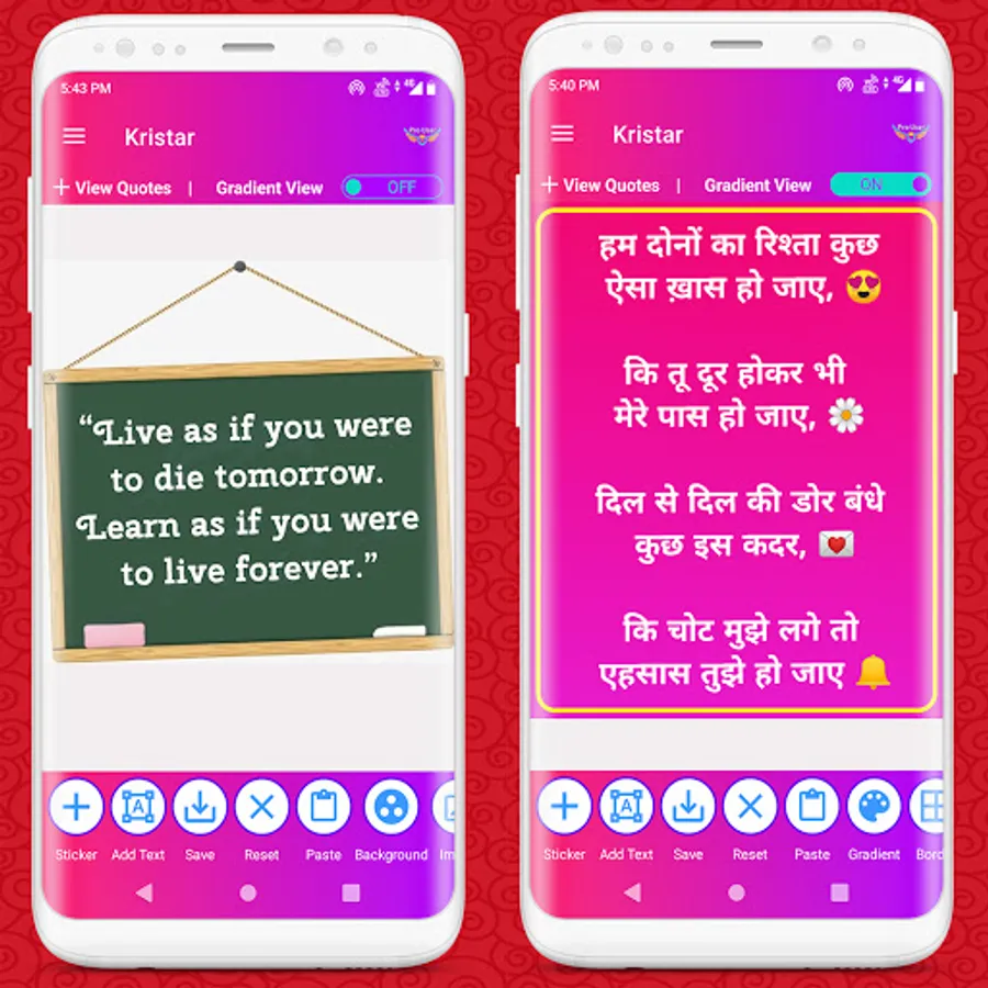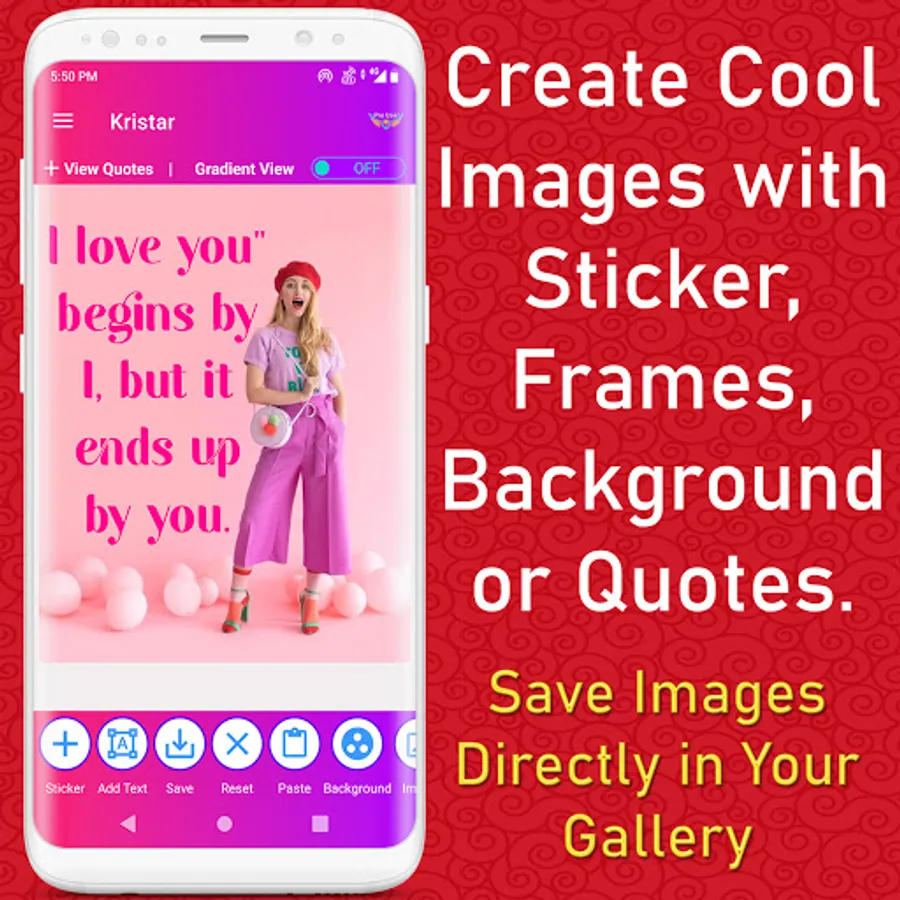 ♥➳ Kristar - Fancy Quotes Maker, is the best and easiest way to create and share your quotes or Shayari with the world. Quotes Creator ready with customizing options such as background, text colors, text size, and fonts, or you can choose your photo from your Photo Gallery to be used as background, so you can share your own quotes with your friends.