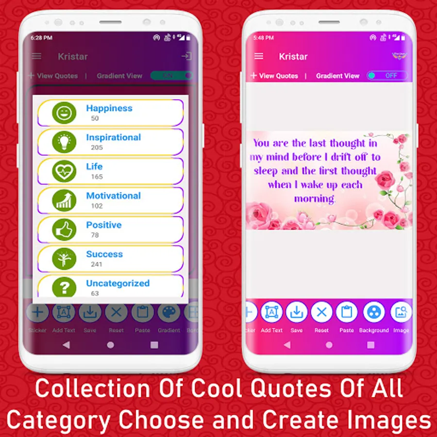 ♥➳ Kristar Quotes Creator is a perfectly built with good design (UI) and user experience. It's a easy, best and user friendly quote generator and quote maker app ever.