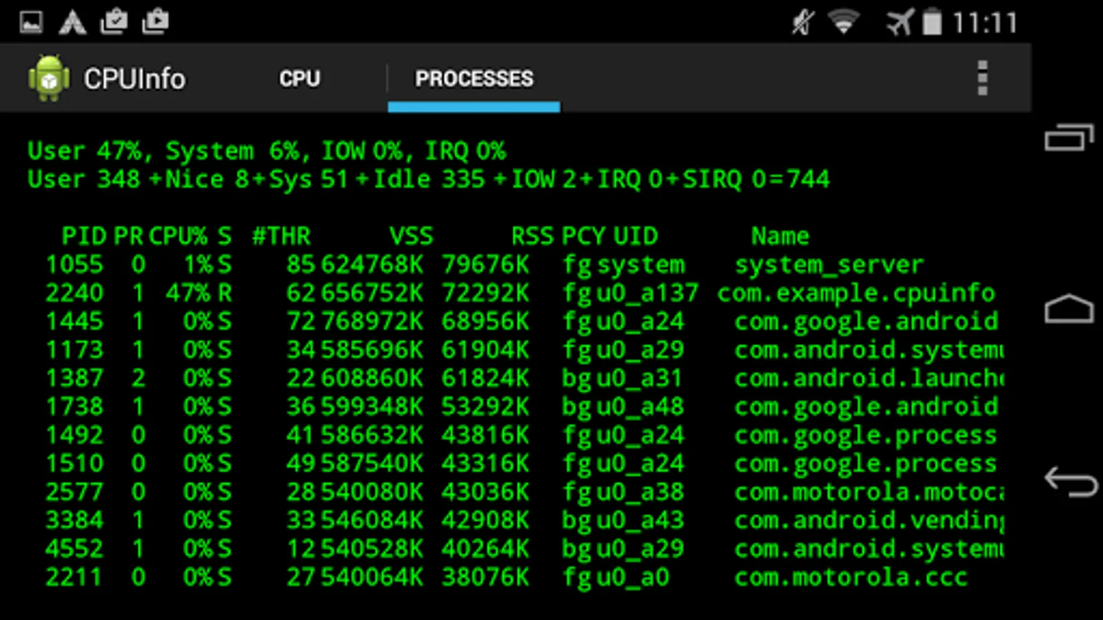 Now with the latest 1.1 update, CPU Info can run ps! Check an individual process by package name or process ID to query its behavior.