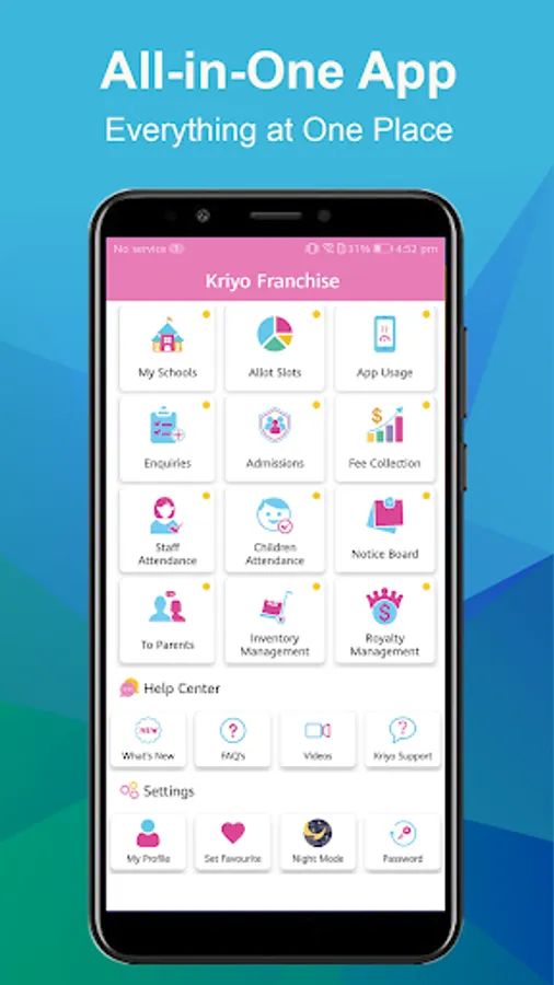 If you are Preschool or Childcare center brand/chain, you 'll certain to get benefited from this app. It gives you a birds eye view into all your branches/centers. You can manage your centers (View/Add/Edit), allocate more slots to add children in their respective centers, view the app usage by your schools' admins / staff / parents. You can also keep track of Enquiries and Admissions for each or all the branches. Also available is the option to track Staff and Children Attendance across all your centers.