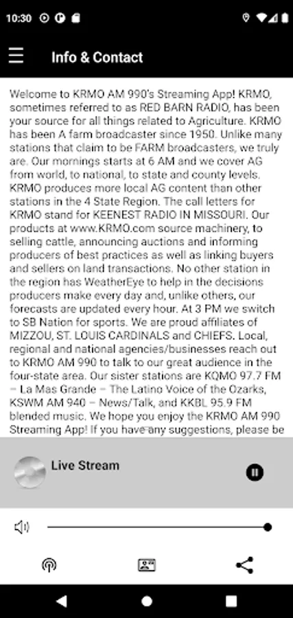 Welcome to KRMO AM 990’s Streaming App! KRMO, sometimes referred to as RED BARN RADIO, has been your source for all things related to Agriculture. KRMO has been A farm broadcaster since 1950. Unlike many stations that claim to be FARM broadcasters, we truly are. Our mornings starts at 6 AM and we cover AG from world, to national, to state and county levels. KRMO produces more local AG content than other stations in the 4 State Region. The call letters for KRMO stand for KEENEST RADIO IN MISSOURI. Our products at www.KRMO.com source machinery, to selling cattle, announcing auctions and informing producers of best practices as well as linking buyers and sellers on land transactions. No other station in the region has WeatherEye to help in the decisions producers make every day and, unlike others, our forecasts are updated every hour. At 3 PM we switch to SB Nation for sports. We are proud affiliates of MIZZOU, ST. LOUIS CARDINALS and CHIEFS.
