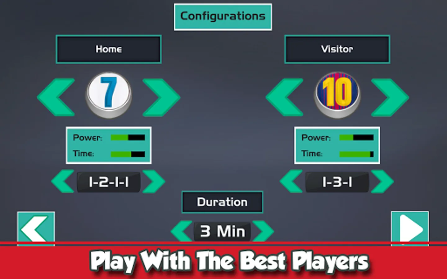 You can choose between the following teams: Brazil, Argentina, Germany, Holland, Spain, United States, Italy, Mexico and the special chips of Messi Ronaldo and Neymar