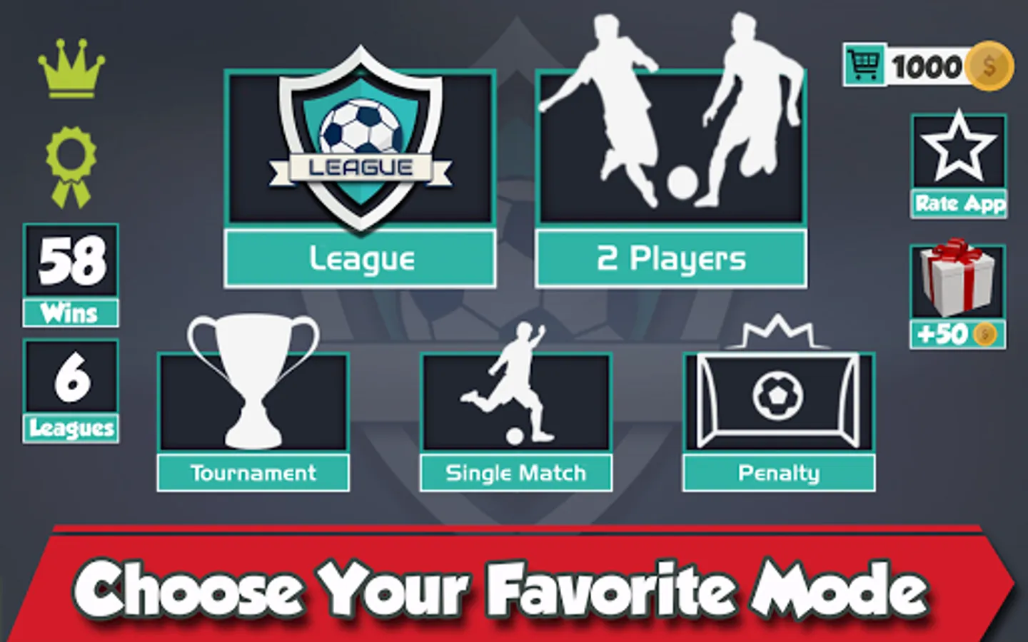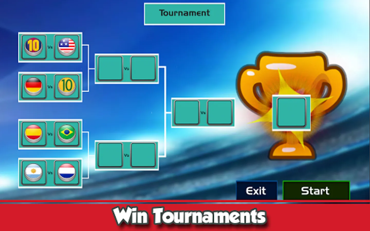 - Tournament Mode: Win the World Cup of Soccer by beating your rivals