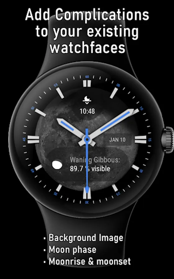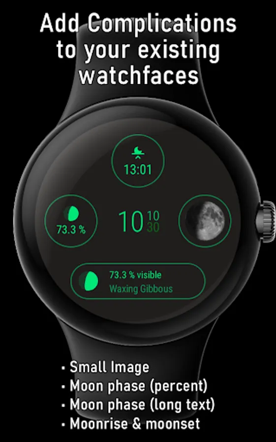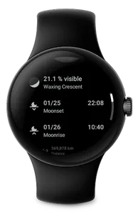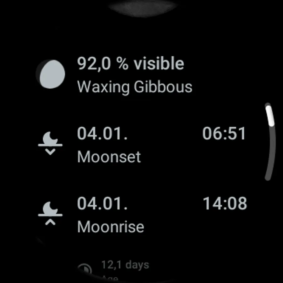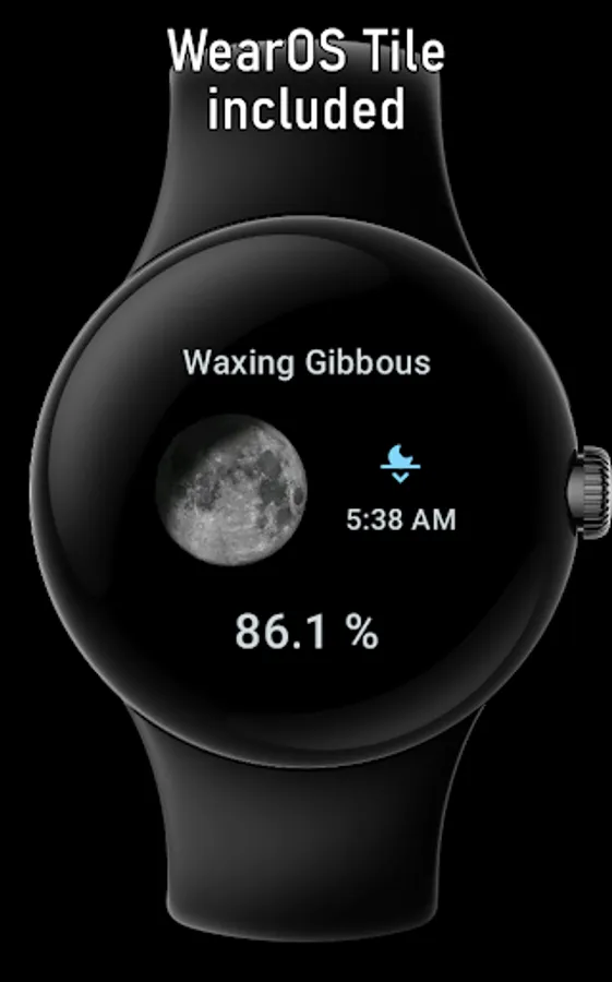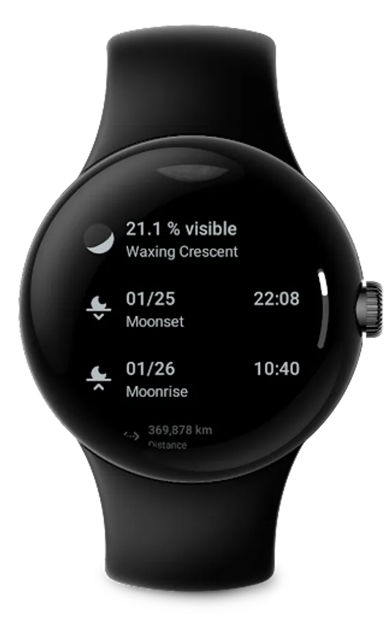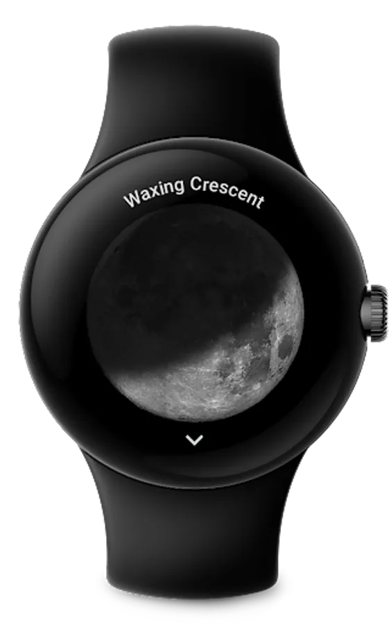 Displays a large, realistic moon. With correct rotation corresponding to your location. Optimized for Wear OS.