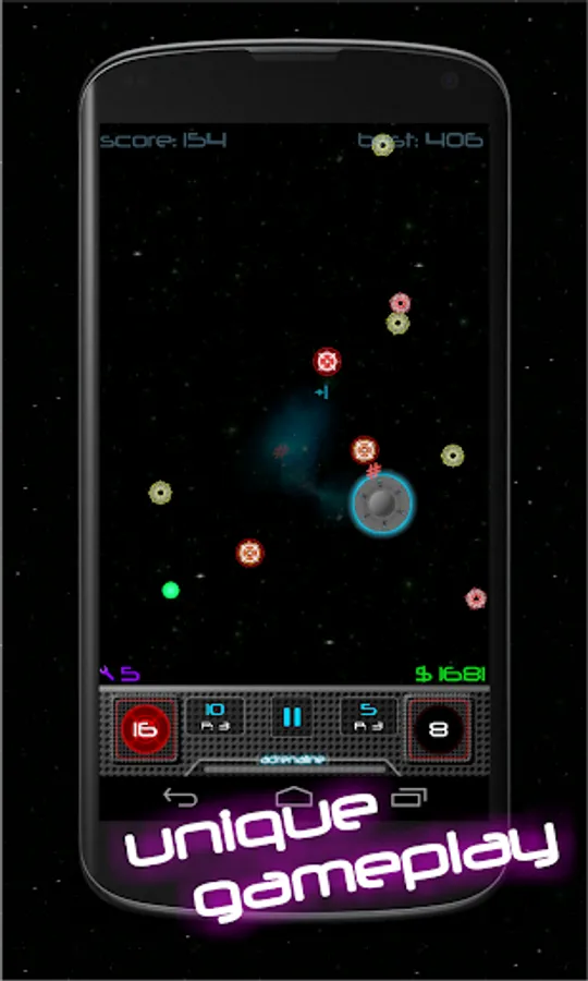 In Alien Drones - Space games, you are in a space war and you are exploring the enemies' galaxy. Your goal is to collect as many resources as possible, while you dodge alien spaceships. The game is simple but becomes pretty challenging as you progress through the game. Each type of enemy has its own movement patterns, and your goal is to collect green circles (resources) while you dodge them.