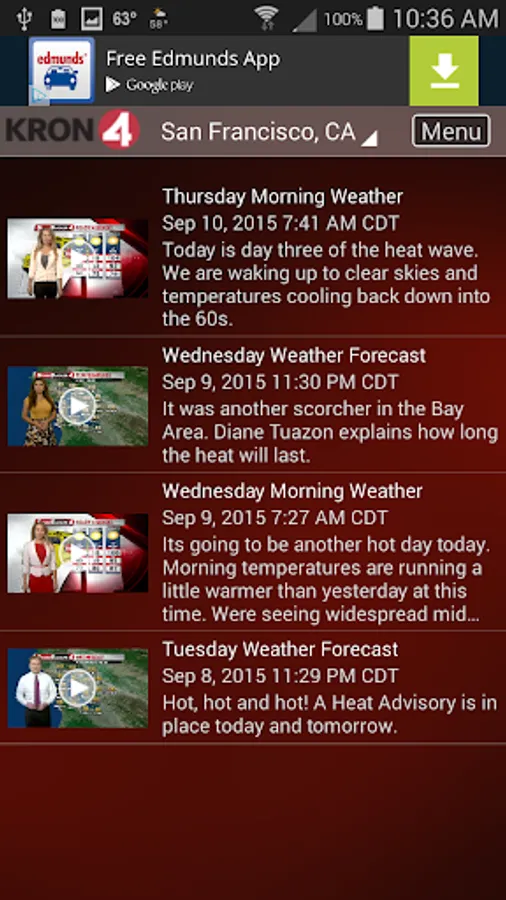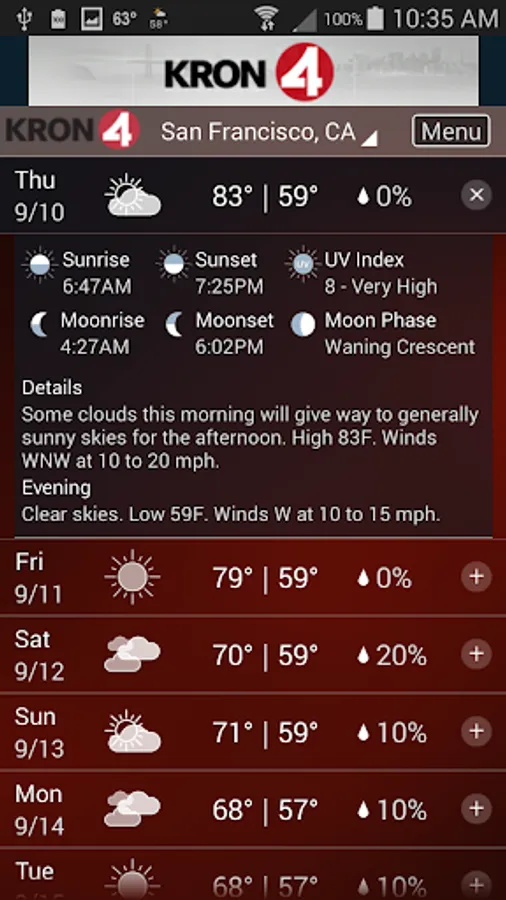 Download the KRON4 Weather app for fast, accurate local and national weather at your fingertips. With its personal alert notifications, you'll know when significant weather is heading your way and when to take cover. And when you are traveling, use KRON4 Weather to get real-time weather forecasts, interactive radar and current conditions for anywhere in the U.S.