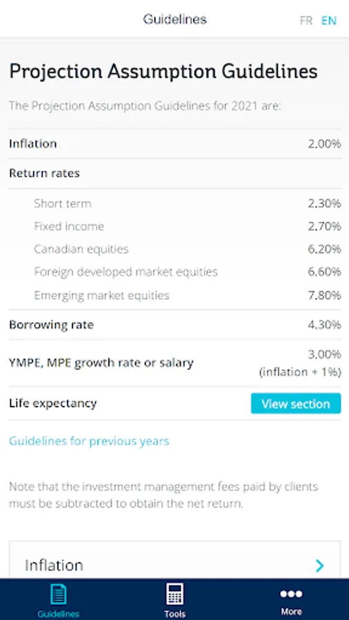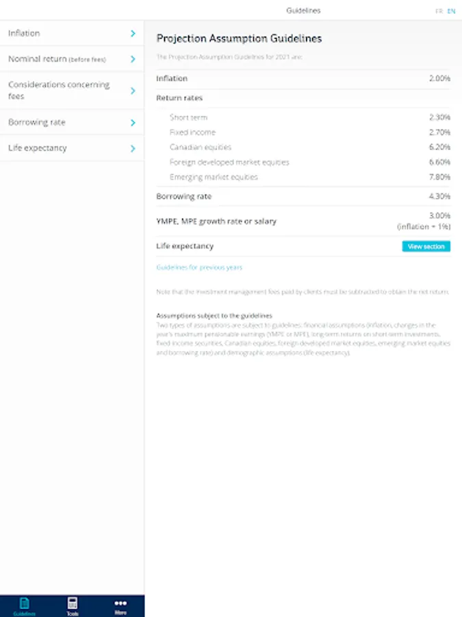 Created by financial planners, for financial planners, the Projection Assumption Guidelines help financial planners make realistic medium and long-term projections by providing an estimate of future inflation and borrowing rates, returns and life expectancy. They are published by the Institut québécois de planification financière (IQPF) and the Financial Planning Standards Council (FPSC), and updated annually.