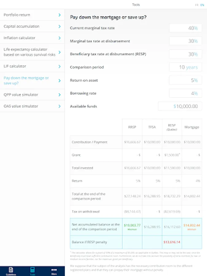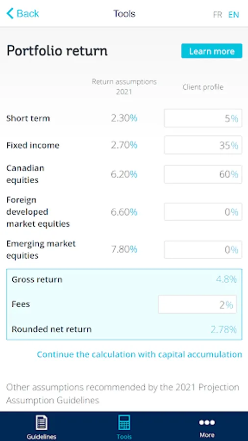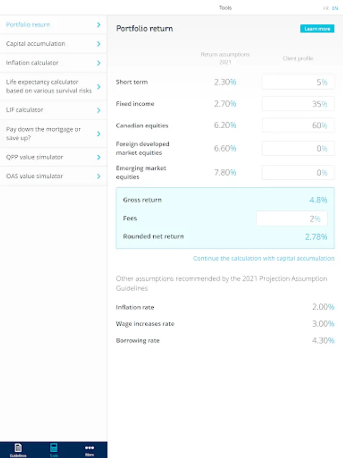 This app’s purpose is to map out the assumptions to use in the preparation of these projections. The app will be useful in the day-to-day work of financial planners since along with its theoretical content, it also includes calculators for inflation, portfolio return, capital accumulation and life expectancy.