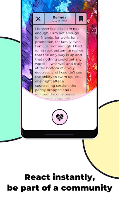 Readers can react to your story, as a way of letting you know you're being heard, and that you're not alone. If you're not yet comfortable sharing your own story, then browse hundreds of stories, react to ones that impact you, and save to your personal collection the stories that you want to remember.