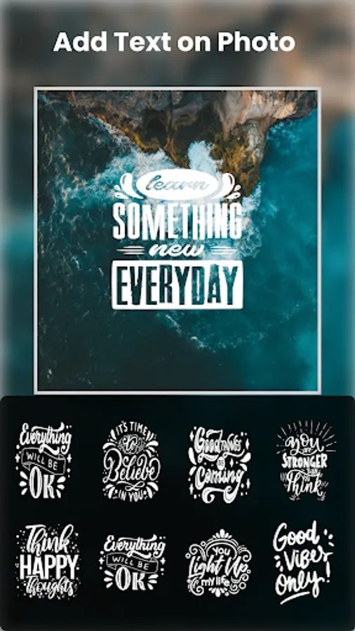 Photo editor text has clean and easy interface to use anyone in any age range. This words on photo app has huge number of lovely stickers, font styles, decorative stickers, quote creator, drawing brush to help you to create attractive text photos