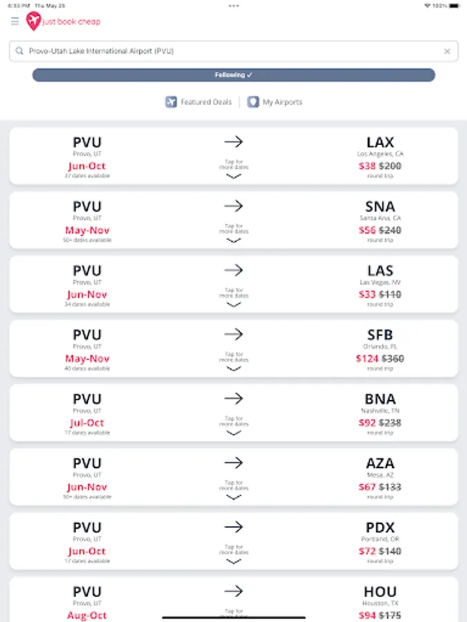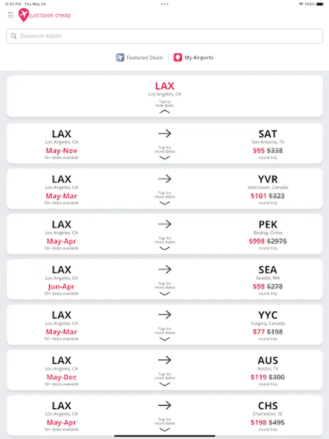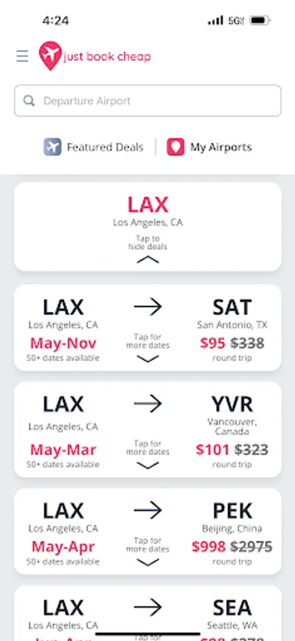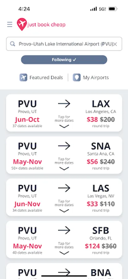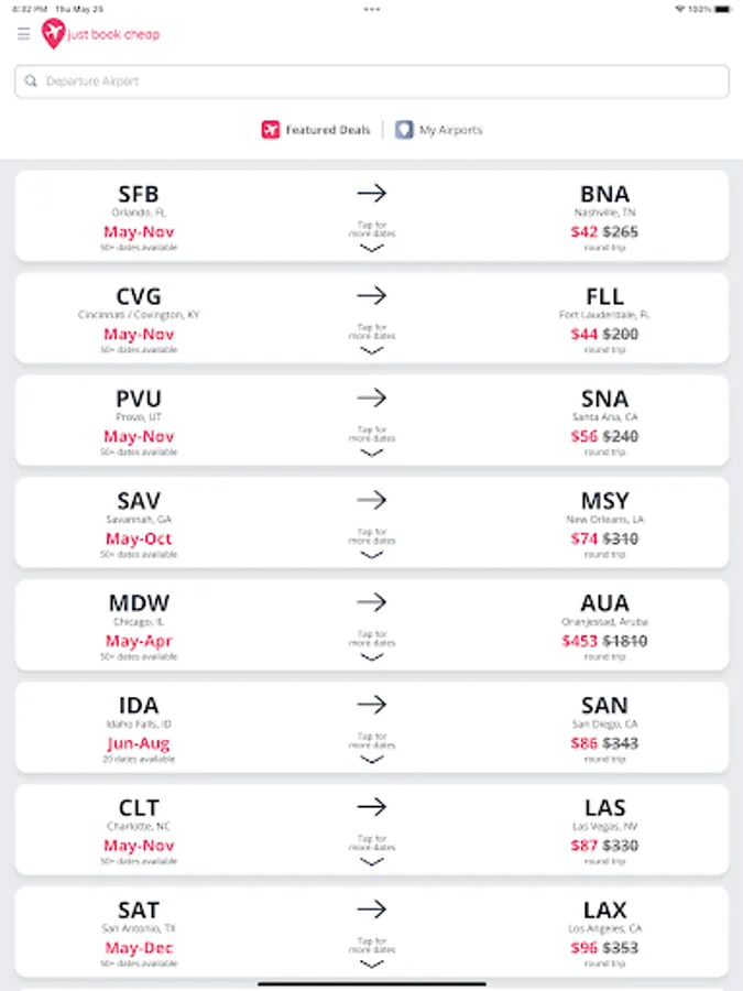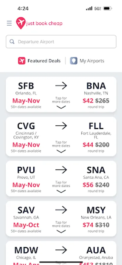Introducing Just Book Cheap - the ultimate app for finding the cheapest flights! With Just Book Cheap, you can select your preferred airports and find amazing deals on flights departing from them. Our app works tirelessly to ensure that you always get the best possible price on your tickets, saving you hundreds of dollars in the process. Say goodbye to expensive travel and hello to Just Book Cheap!