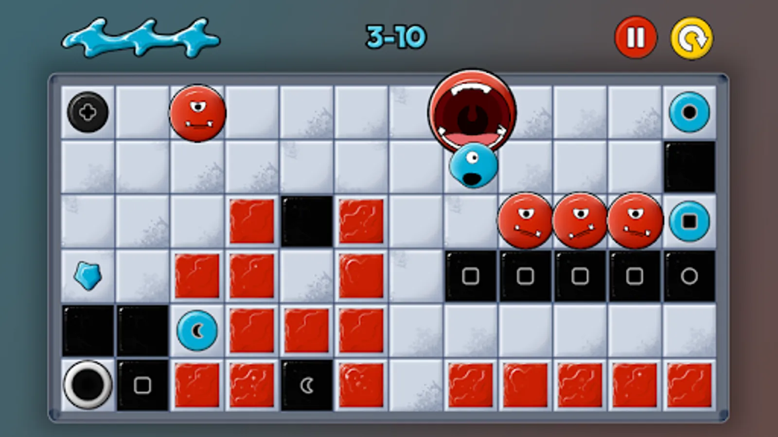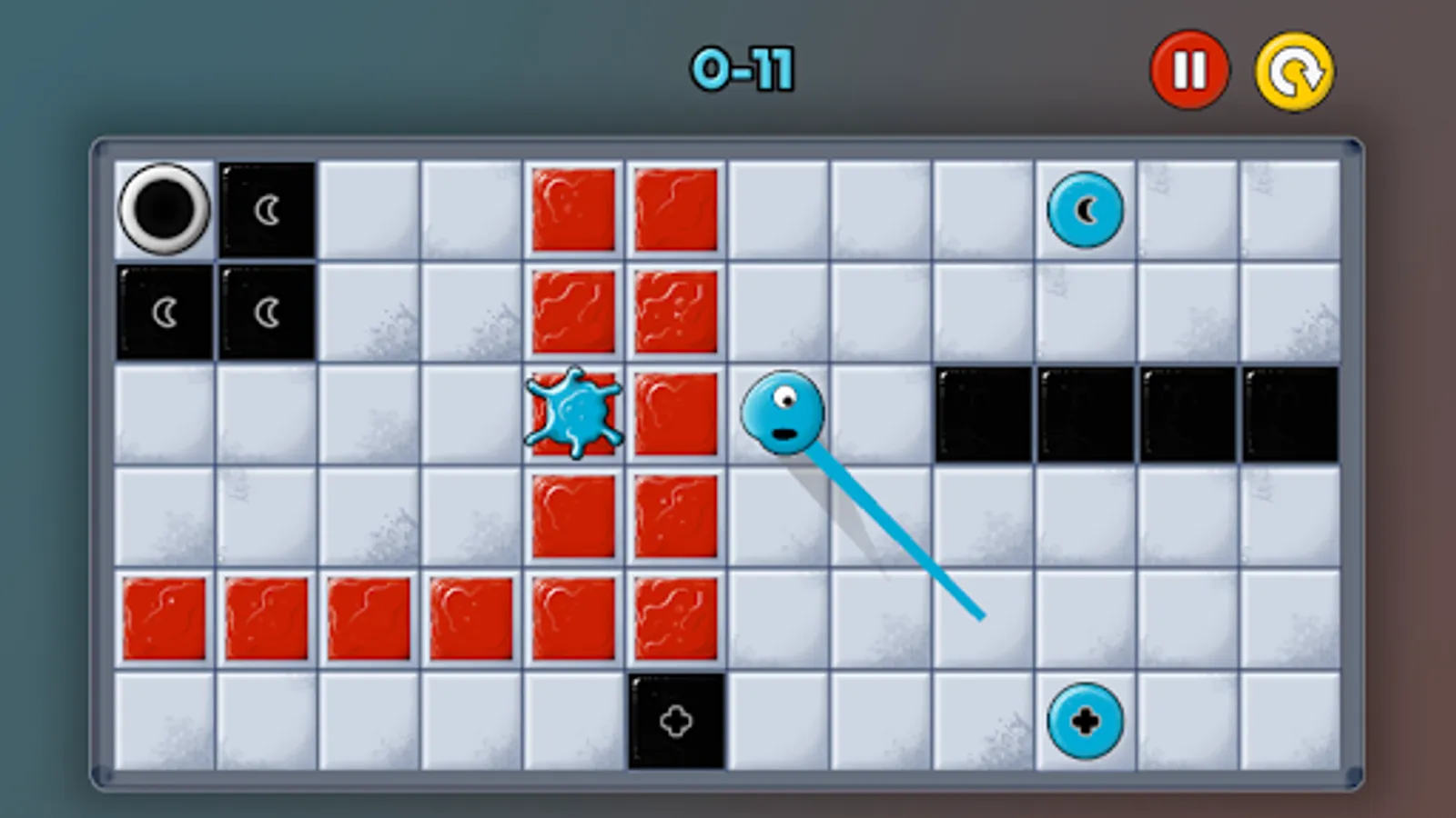 To solve the grid-based puzzles in each level, you will need Squishy’s special ability: He is able to revive from a blue blob, which he has located somewhere on the tiles. In so doing, he overcomes obstacles like walls, portals, switches, ravenous cyclopes and the dangerous red tiles.