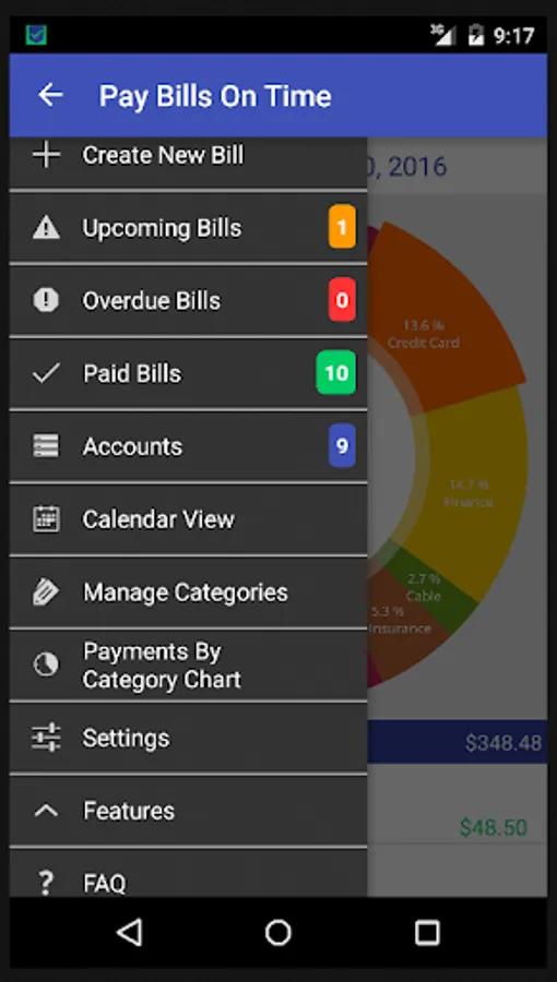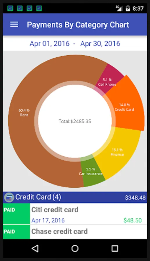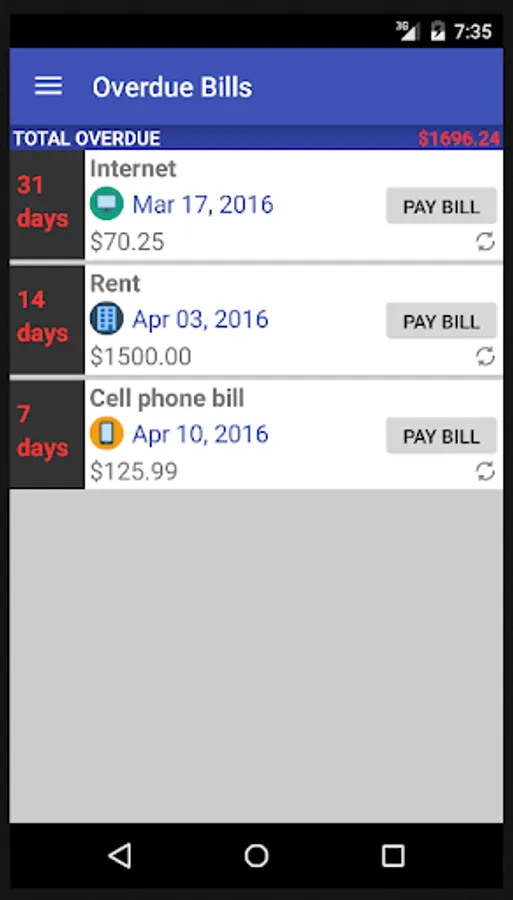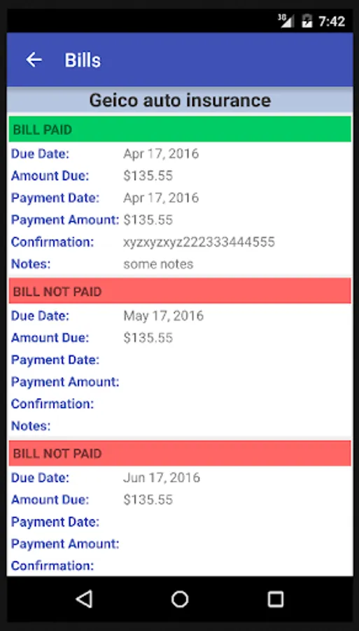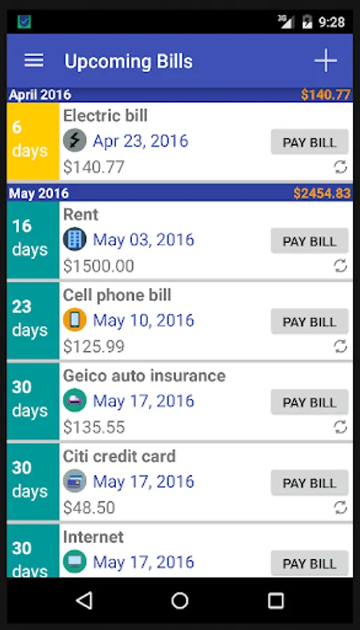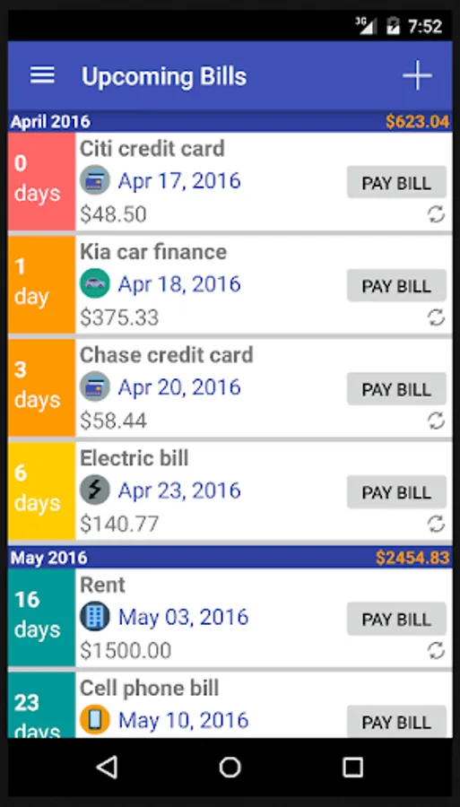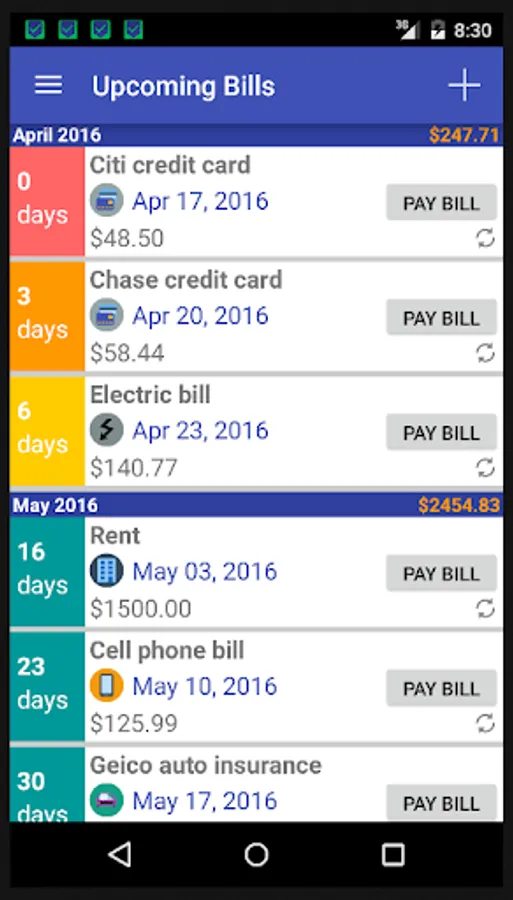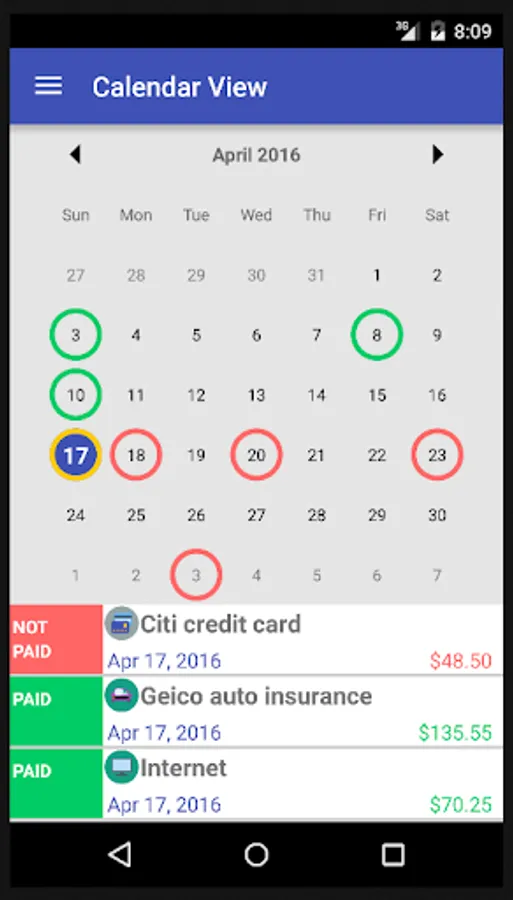 - App’s calendar gives you quick view of whether all bills that are due on certain day have been paid. Calendar days are color coded with one of the following statuses: Green (all bills have been paid), Yellow (some bills have been paid), Red (none of bills have been paid).
