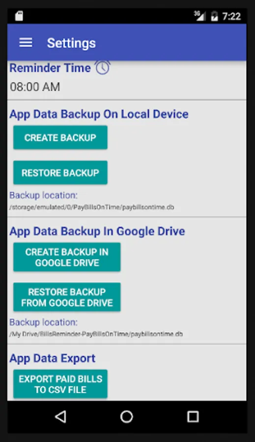 - Bills Reminder app gives you ability to backup and restore data from Google Drive or your device.