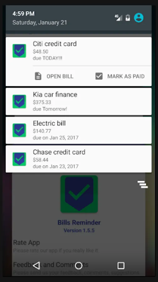 - Bills Reminder app sends payment reminder notifications on your device regardless whether the app is open or closed, or after restarting your device. Mark bill as paid from within notification without starting the app.