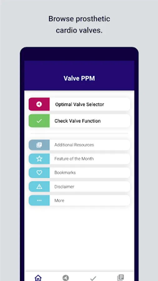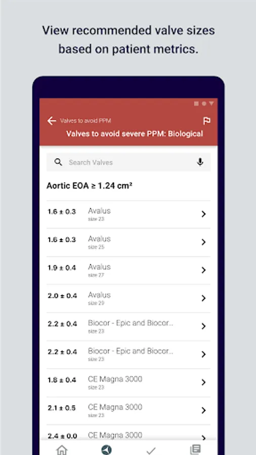 The application provides guidelines for assessing an already implanted valve (Check Valve Function) and for choosing a valve before implantation (Optimal Valve Selector). The algorithms behind the App have been derived after an extensive research of the published materials on the aortic and mitral prosthetic valve assessment.