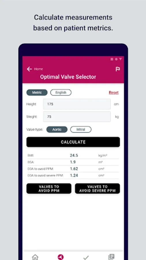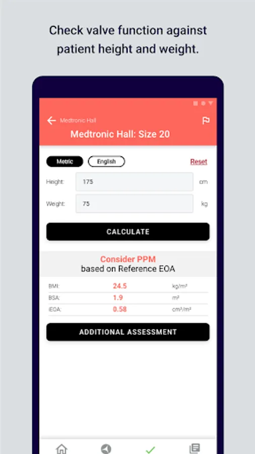 After selecting a particular valve type, the patient characteristics (weight/height) and the prosthesis actual parameters (peak velocity, mean gradient, VTI prosthesis, VTI LVOT and LVOTd), Valve PPM will provide the user with an answer regarding the normal function of the valve, the potential patient prosthesis mismatch or the intrinsic prosthesis dysfunction.