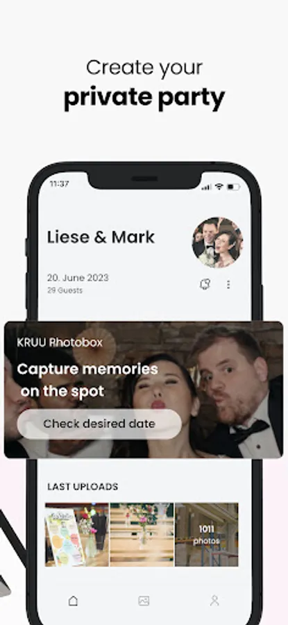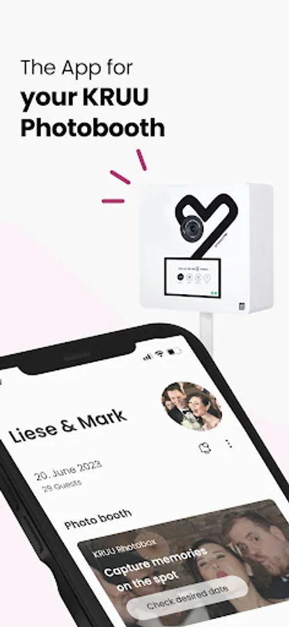 Your KRUU photobooth photos will also be transferred exclusively to the app. Best of all, the basic version is free (minimum 6 months). With our photo app, all the pictures of your guests can be easily shared with each other. Benefit from the many advantages and let your guests share in your happiness.