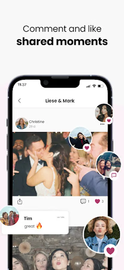 Discover the most amazing wedding photos in a beautiful feed and respond with likes & comments