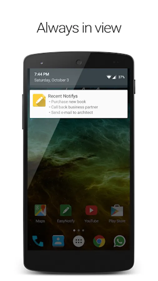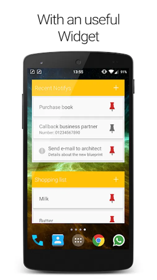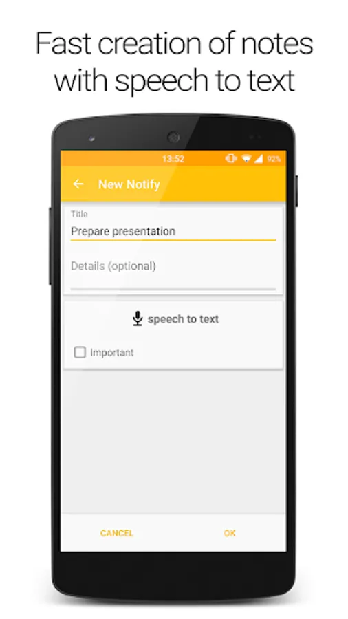 With Easy Notify you will never forget anything. A Notify is a note that reminds you of your task or any other thing. To manage your Notifys, you can easily create a new list and add new Notifys to it. Also, you can create a widget on your homescreen to add and manage your notes easily. Notifys can be sticked to your notification bar, so you have alwasy a look at your memos. The App has also a nice speech to text function, contains no ads and is free forever.