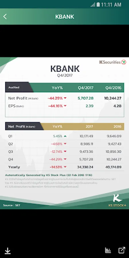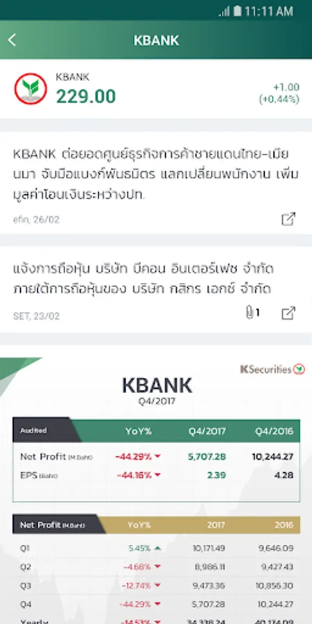 - ติดตามข้อมูลข่าวของหุ้นที่สนใจ จากแหล่งข่าวที่น่าเชื่อถือ สรุปงบการเงินจากระบบอัตโนมัติ และบทวิเคราะห์จากหลักทรัพย์กสิกรไทย