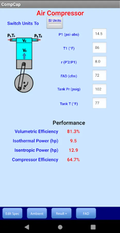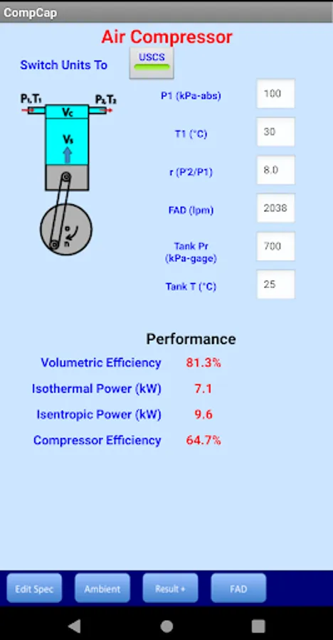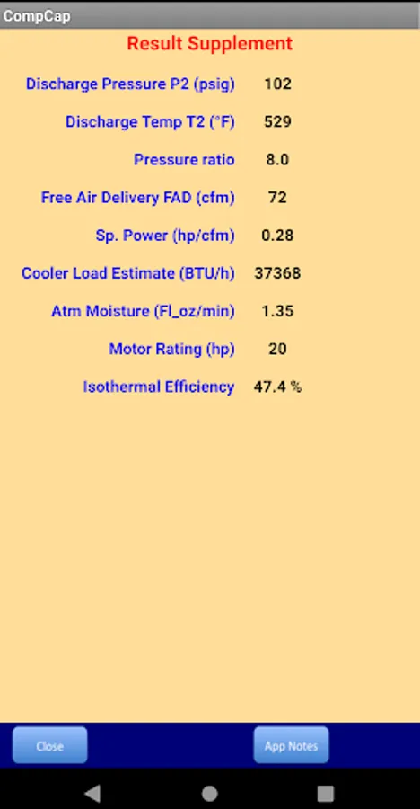 Manufacturers give compressor specification data such as FAD, power and other efficiencies at certain standard operating conditions. But, most compressors normally operate between two set pressure points for loading and unloading. Therefore app uses a hypothetical pressure ratio of average discharge pressure to ambient to compute different performance indices. Further, any change in operating conditions such as atmospheric pressure due to altitude, temperature, humidity etc. could also have considerable impact on compressor performance. A typical example is shown in screen shot. Thus app can be a helpful tool for different operation and maintenance personnel to evaluate compressor performance time to time.