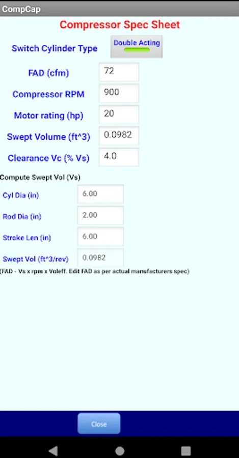 A typical compressor specification data sheet is show in the screen shot. FAD, pressure rating and motor hp and rpm data are the minimum requirement based on manufacturers data sheet. Additional data pertaining to reciprocating cylinder data helps to determine the range for FAD for general verification. Volumetric efficiency is primarily depended upon cylinder clearance and generally present in most compressors and in the range of 2% to 8% of total swept volume.