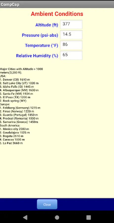 Ambient properties such as atmospheric pressure, temperature and humidity values are taken as key input to the computation model. The app computes the pressure for any given altitude. Data for some of the higher altitude (> 1000m) cities around the world are also provided for convenience.