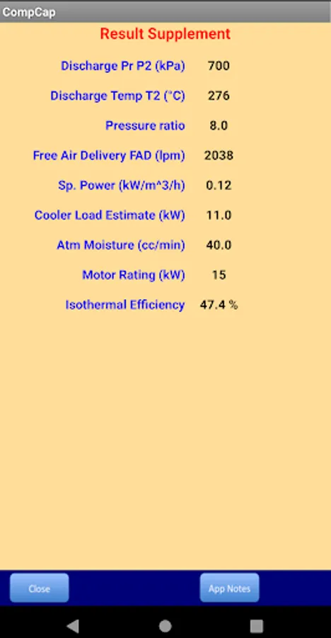 A comprehensive result summary provided that includes heat load for the inter coolers, moisture content etc. as shown in screen shot. Additional information is provided in app notes that includes FAD, leakage computation models for quick reference.