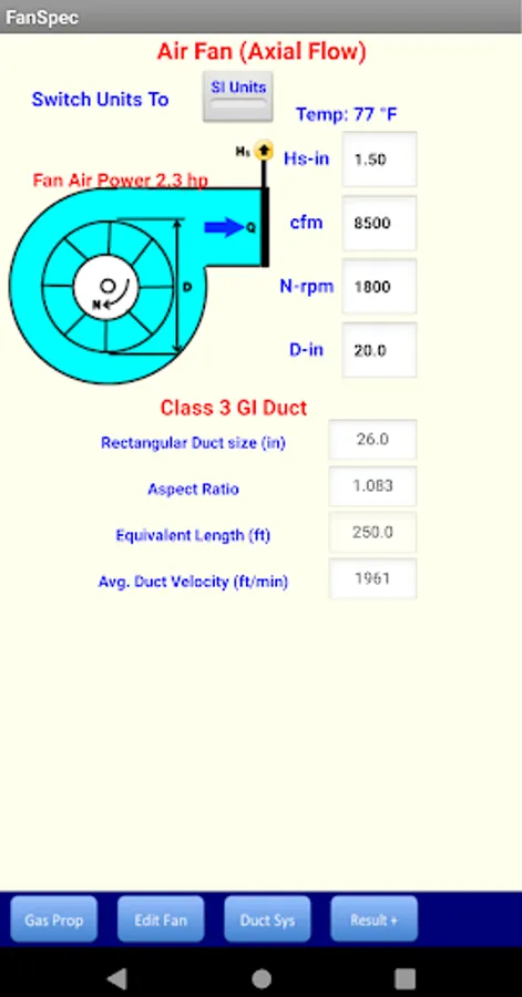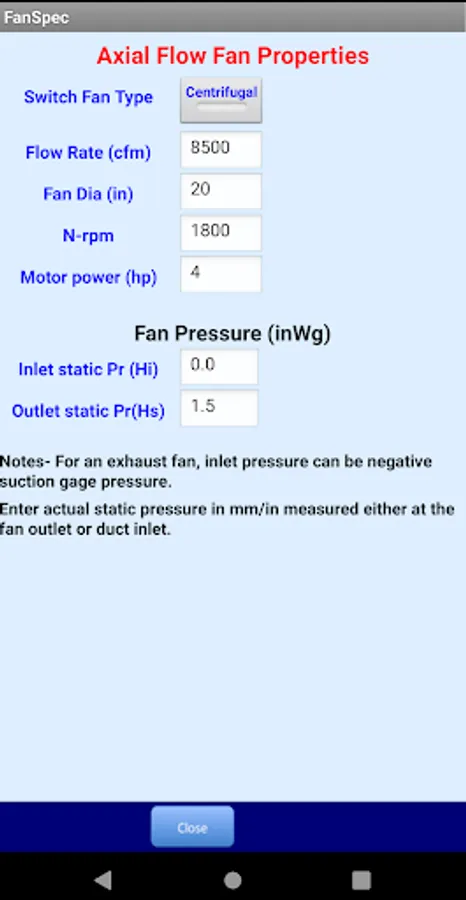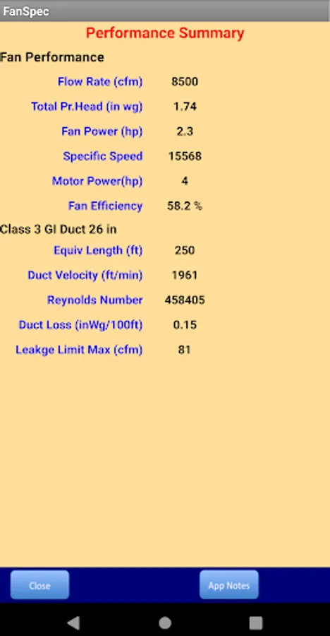 App helps in evaluation of different fan specifications for a given application. Most manufacturers provide fan curve (Q vs H) and the operating point on this curve depends on the type of duct system, the average duct velocity, duct pressure loss and duct leakage rates. Thus selecting a right fan for the given duct system is very critical to the satisfactory performance and energy efficiency.