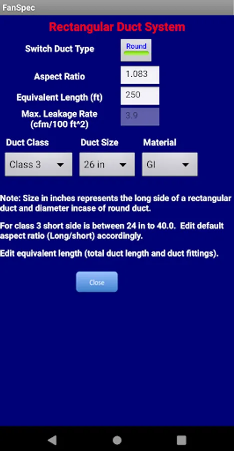 Users can choose any duct system based on cross section, class, size and material. Upon selection, app auto updates the duct leakage rates as per recommended standards. The total equivalent length data is used for evaluation of duct losses that includes resistance due to different duct fittings and terminal boxes.