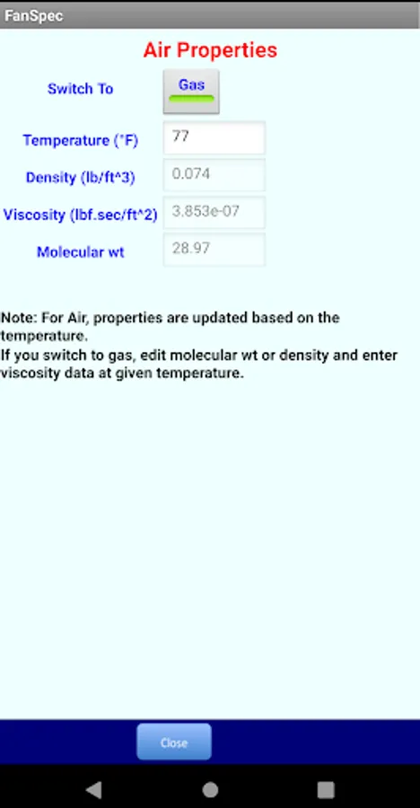 By default Air is used as gas medium and its properties are updated based on the input temperature. For gases other than air, edit the property data such as density, viscosity at given temperature.