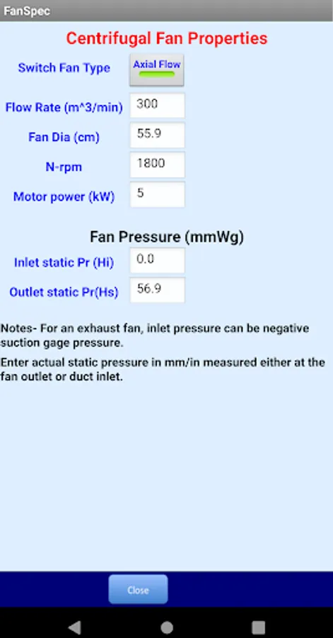 Fans are categorized based on the type of flow. The flow can be either axial or radial by centrifugal action based on type of application. Fan specification data such as rotor diameter, fan rpm, motor power and flow rate at given static pressure need to be provided that will be evaluated against the given duct system.