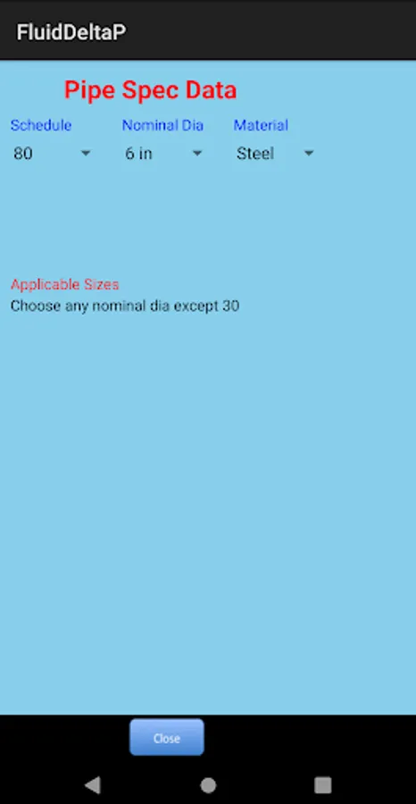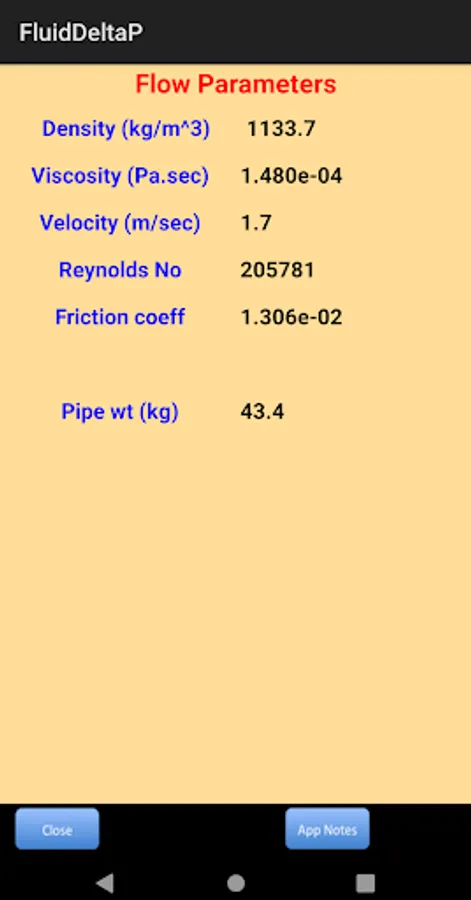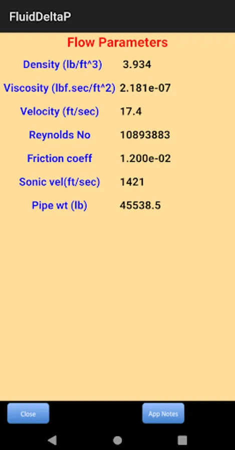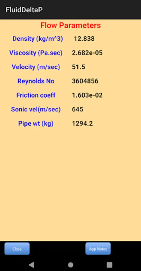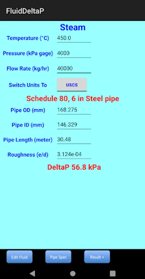 Fluid velocity, Reynolds number and pipe friction coefficient are computed as a function of pipe size, fluid density and viscosity. App has its own algorithm to compute the coefficient of pipe friction based on roughness factor and Reynolds number under turbulent conditions and for laminar it is purely a function of Reynolds number and irrespective of pipe roughness. For more accuracy users can edit the pipe roughness factor. For gases, additional data on sonic velocity is provided for a quick reference. This would also helps in determining pressure loss using other user’s methods.