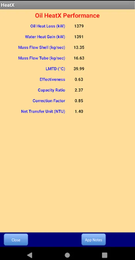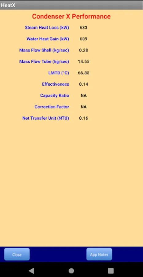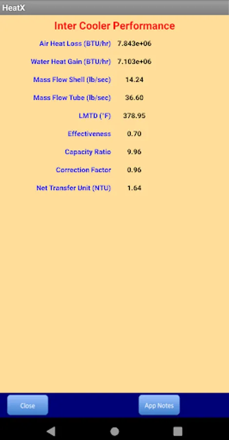The over all heat transfer coefficient is computed and presented in the main screen. The additional result gives different key performance characteristics of a heat exchanger. App notes has all the definition and brief descriptions of different key parameters presented in the summary.