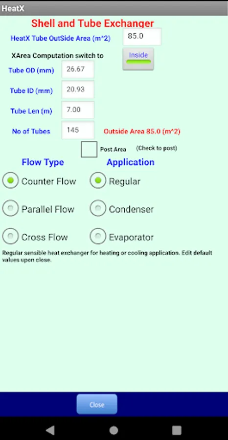 One can choose heat exchanger depending upon type of application as well as flows. Both inside and outside heat transfer area can be computed using the tube side dimensional data for verification purpose as shown in the following screen shot.