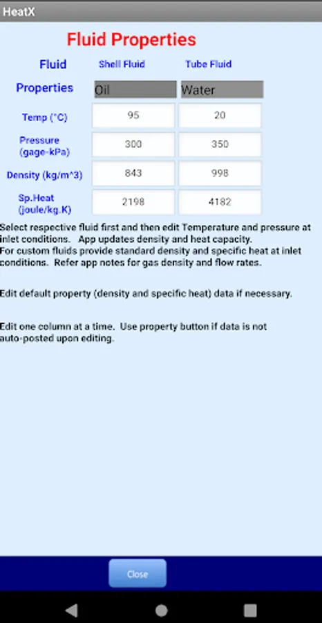 Users can quickly select different fluids for both shell side and tube side application from a list of most common fluids used in industrial applications. The key property data such as density and heat capacity is evaluated based on given temperature and pressure for the given fluid. For fluids that are not in the list, users can create a custom fluid with known property data. Data can be edited in both SI and USCS unit standards.