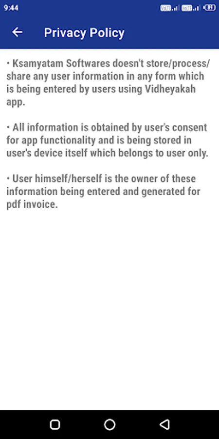 Ksamyatam Softwares doesn't store/process/share any user information in any form which is being entered by users using Vidheyakah app.All information is obtained by user's consent for app functionality and is being stored in user's device itself which belongs to user only and user himself/herself is the owner of these information being entered and generated for pdf invoice.