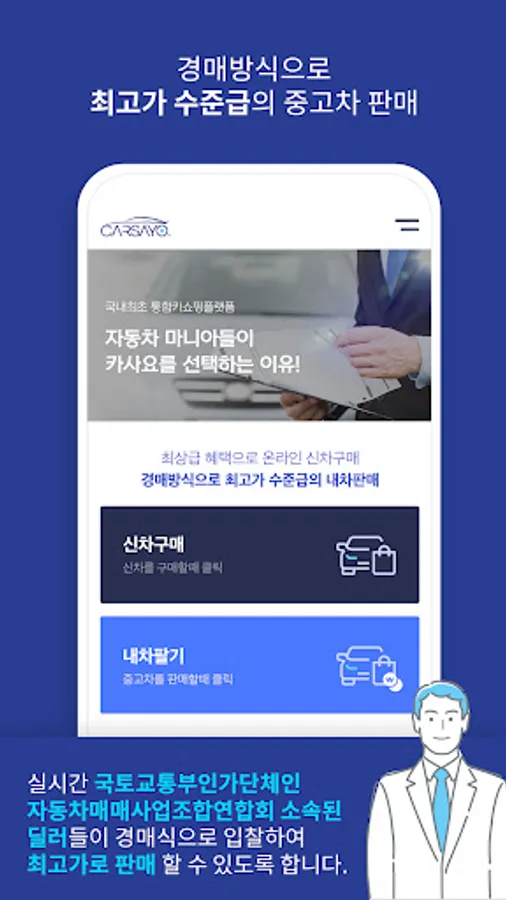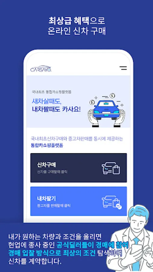 Based on the trust accumulated through 24 years of know-how, we built a nationwide automobile distribution network system and implemented it as an online application in mobile in 2021 to create Casayo. Casayo is an online integrated sales platform that provides reasonable specifications for each customer from consultation to contract, shipment and registration for customers who need to be thoroughly scrutinized for new car purchase and used car sales. Consultation, shipment, purchase by providing a comparative analysis of experts in each field at a glance, including official brand dealers, new car agencies, financial companies, used car dealers affiliated with the Automobile Trade Association, an accredited organization by the Ministry of Land, Infrastructure and Transport, and direct insurance companies at a glance By minimizing the complicated and cumbersome process from sales to sales, we provide a dream car life that is optimized for your lifestyle.