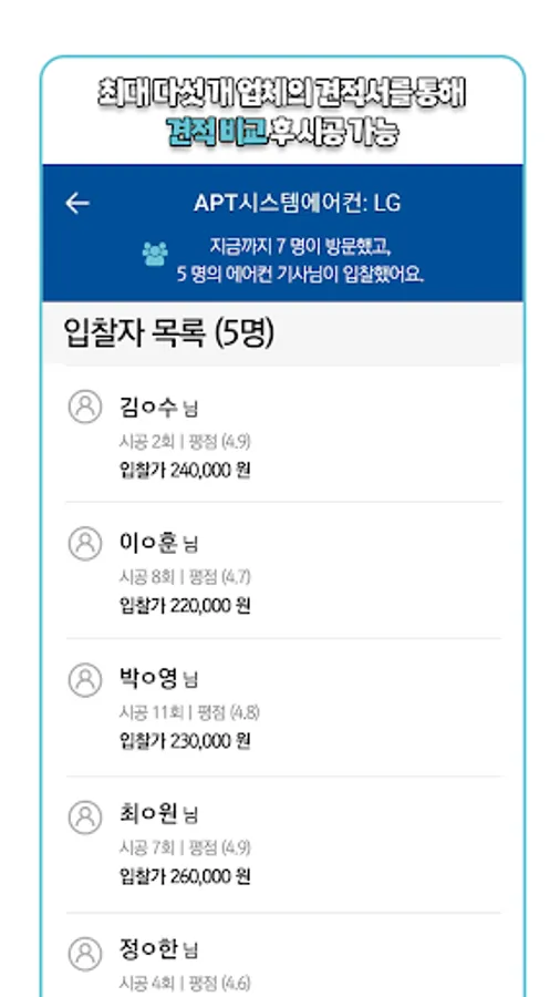 'Transparent Quote' means that when a consumer who needs an air conditioner selects the type of service he or she wants through a smartphone application, air conditioner companies in each region submit a quote and portfolio. It is a system that allows you to choose