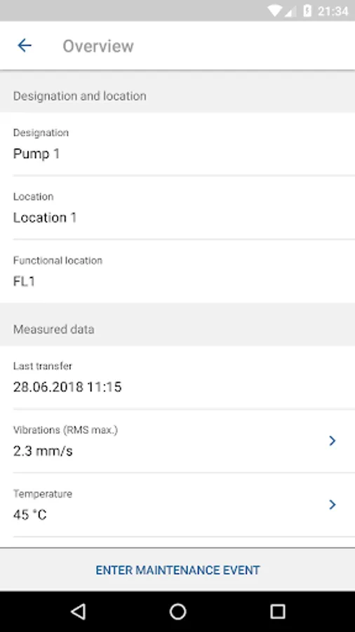 A vibration sensor and a temperature sensor record data directly at the pump.