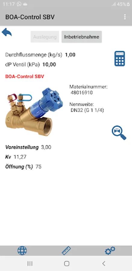 After entering system parameters such as the volume flow rate Q and differential pressure DP or, alternatively, the power required as well as the supply and return temperature, static balancing valves, differential pressure regulators and pressure-independent control valves (PICV) are conveniently selected.