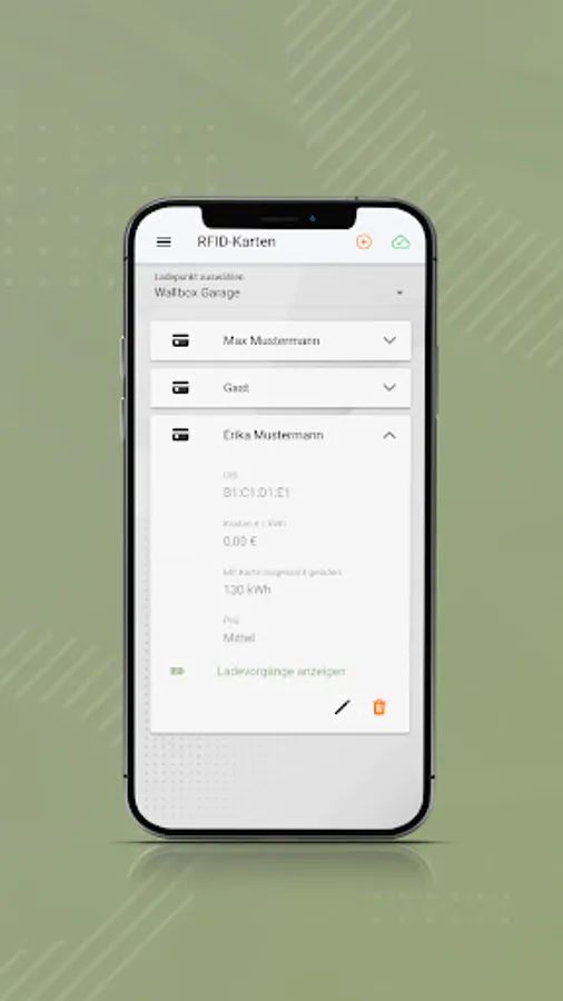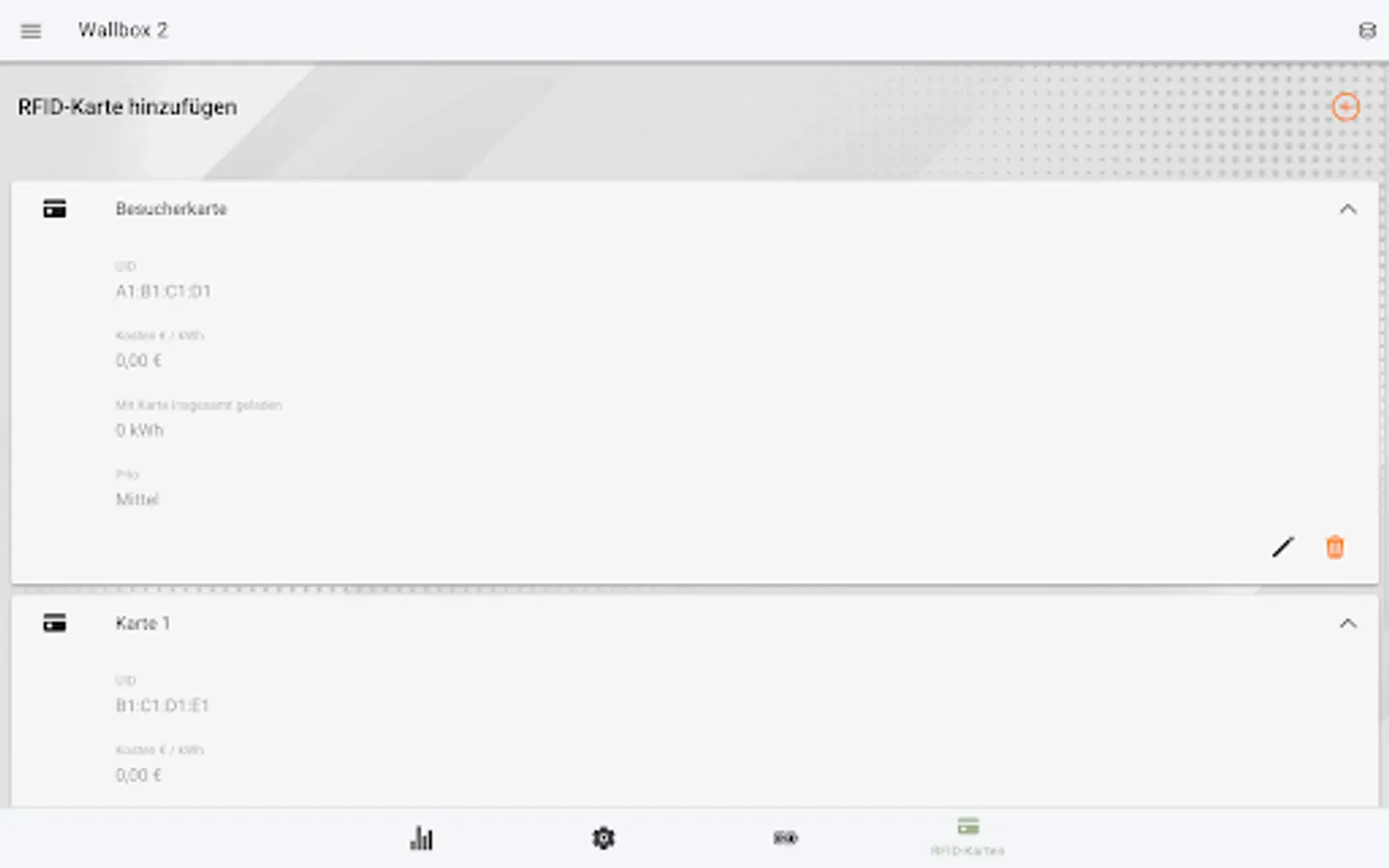 In conjunction with the KSE Wallbox wBX16 RFID smart and wBX16 ChargeConnect, the RFID tags can be conveniently managed via the app and even taught in if the NFC module is available. New tags can be added or removed. Existing tags - e.g. from the garage door or the house's access system - can be trained on the wall box and then also managed via the app. And of course you can display all parameters, such as consumption, charging time, etc. per day at any time.