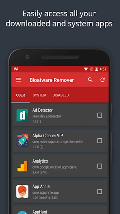 The most convenient, fastest, most versatile and easiest-to-use uninstall and bloatware remover tool. It cleans bloat in your android phone in no time. Removing bloatware has never been this easier. This is the only bloatware remover tool you need to disable bloatware.